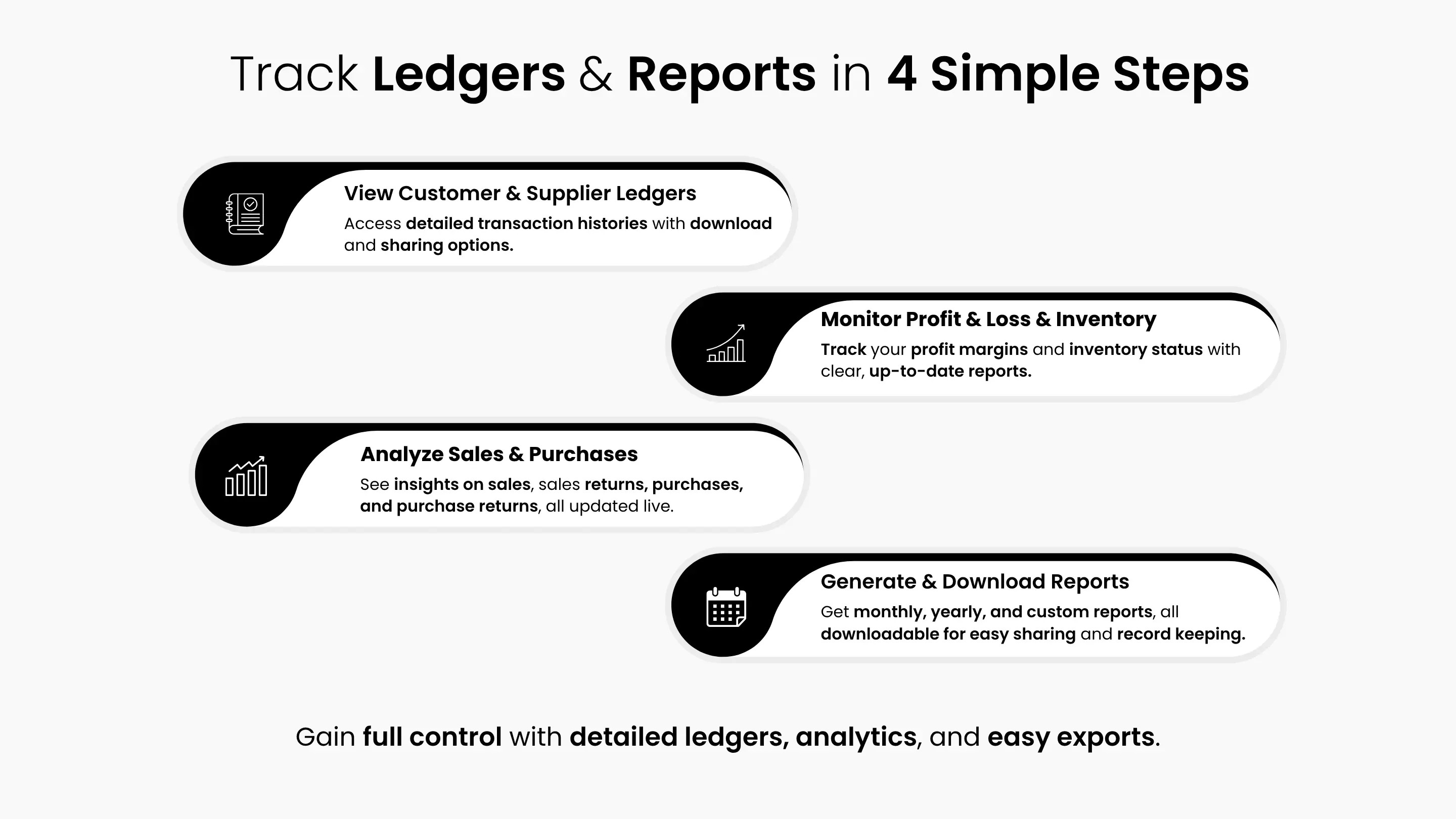 Track sales, sales return, purchases, purchase return, manage finances, inventory, connect with a supportive business community – all in one place.